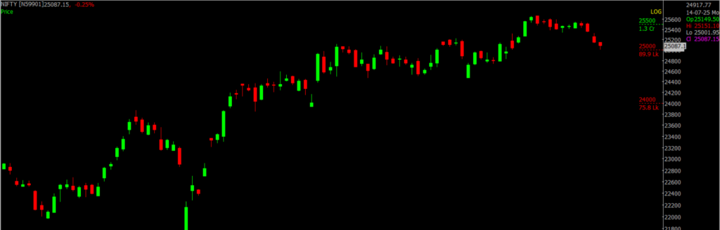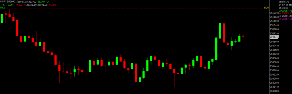 Bearish mood continued in Indian equities as the Nifty50 opened the week on a weak note, extending its decline to briefly test the psychological mark of 25,000. However, a sharp rebound in the latter half of the session helped the index trim losses and close at 25,082.30, down by 67.55 points.
