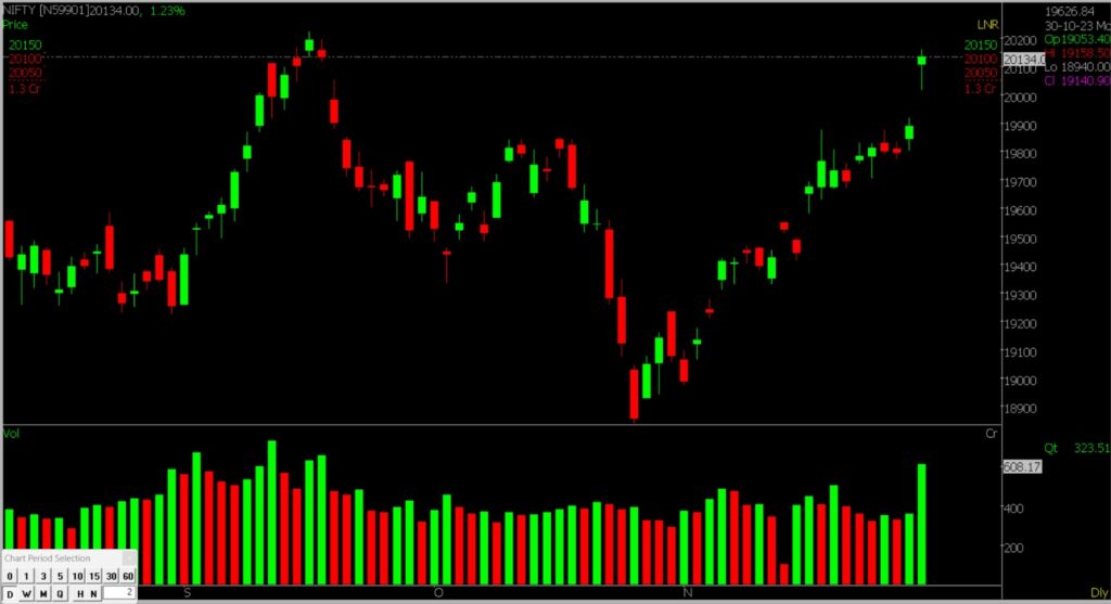 Indian equity benchmarks marked a second consecutive day of gains on November 29, as the Nifty exceeded 20,000 for the first time in over two months, driven by positive global cues and substantial buying in major stocks; at closing, the Sensex surged 727.71 points (1.10 percent) to 66,901.91, and the Nifty rose by 206.90 points (1.04 percent) to 20,096.60, with the market opening on a gap-up note and sustaining momentum throughout the day, reaching beyond 21,100, except in the realty sector.