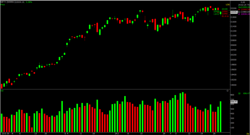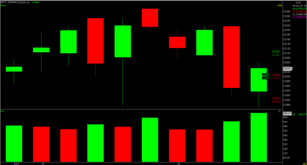 On the day of monthly expiry, the Nifty faced ups and downs before finally ending unchanged. Currently, there seems to be a somewhat negative sentiment prevailing. Positioned at the lower end, there is crucial support at 21900; if the index holds above this level, there is a chance of seeing a recovery. However, dropping below 21900 could potentially push the index towards 21850.