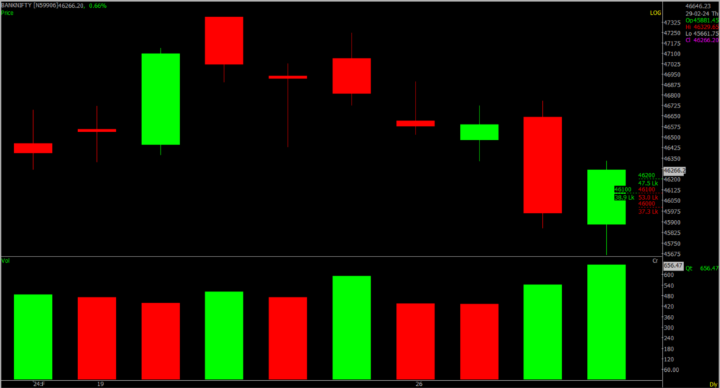 The bulls in BankNifty demonstrated their power by protecting the important support level of 46100, leading to a close above it. This indicates strong bullish activity at lower levels. However, the index is currently facing notable resistance at 46300, and breaking decisively above this level is expected to prompt more short-covering, potentially driving the index towards the 46700 level. To confirm that the index has formed a bottom, there needs to be consistent trading above 46100 for several sessions.