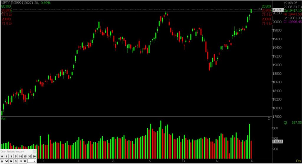 Indian equity indices kicked off December and the new series robustly, reaching a record high on December 1, propelled by optimism over higher-than-expected GDP data and widespread buying across sectors, except for auto, with Sensex closing up 492.75 points at 67,481.19, and Nifty up 134.70 points at 20,267.90; both indices sustained their winning streak for the fourth consecutive session, surpassing the previous high set on September 15, 2023, and concluding the week with a 2 percent gain each for BSE Sensex and Nifty50.