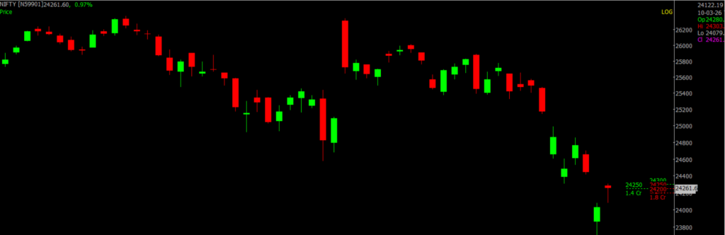 On March 10 , Sensex was up 639.82 points at 78,205.98, and the Nifty was up 233.55 points at 24,261.60. About 2,998 shares advanced, 1,111 shares declined, and 125 shares remained unchanged.