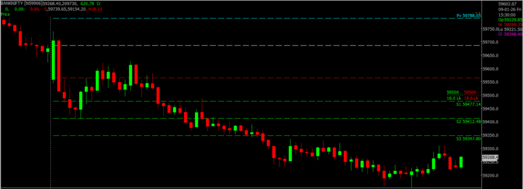Bank Nifty is showing a weak to range-bound bias for 12th January. The index has been facing selling pressure at higher levels, indicating cautious sentiment among traders. On the downside, 59,000 remains a crucial support, and a breakdown below this level could extend the fall towards 58,800, where some buying support may emerge. On the upside, any recovery is likely to face stiff resistance near 59,500, while a stronger hurdle is placed in the 60,000–60,400 zone, which may limit further upside unless there is strong buying momentum. Overall, Bank Nifty may continue to trade volatile, with traders advised to stay cautious near resistance levels.