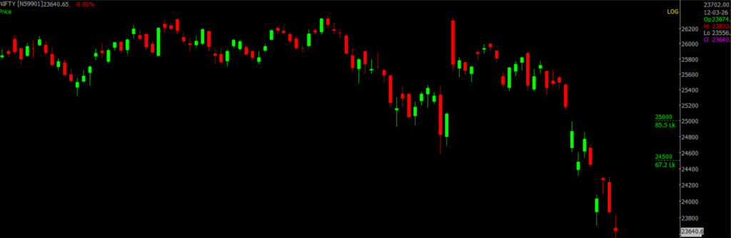 Nifty continues to display a weak technical structure, forming a clear pattern of lower highs and lower lows on the daily charts. The index closed at 23,640, down about 226 points, and slipped below the 23,700 support level, which had been holding in recent sessions.