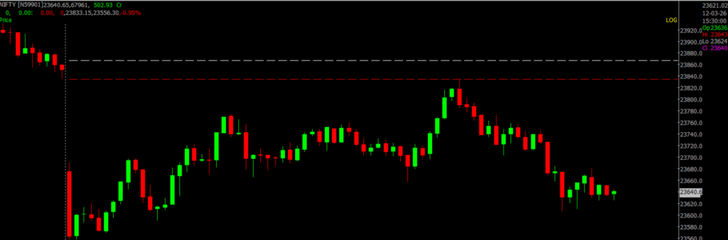 The breach of this support indicates that selling pressure remains dominant. Immediate support is now seen in the 23,500–23,000 zone, and if the index sustains below today’s low of 23,556, the decline could extend toward the lower end of this support band.