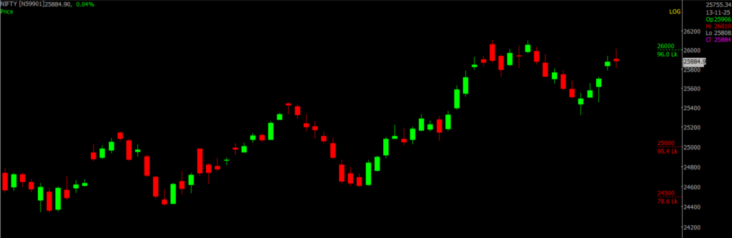 On Nov 13, Sensex rose 12.16 points to 84,478.67, while the Nifty added 3.35 points to 25,879.15. Around 1,661 stocks advanced, 2,193 declined, and 107 remained unchanged.