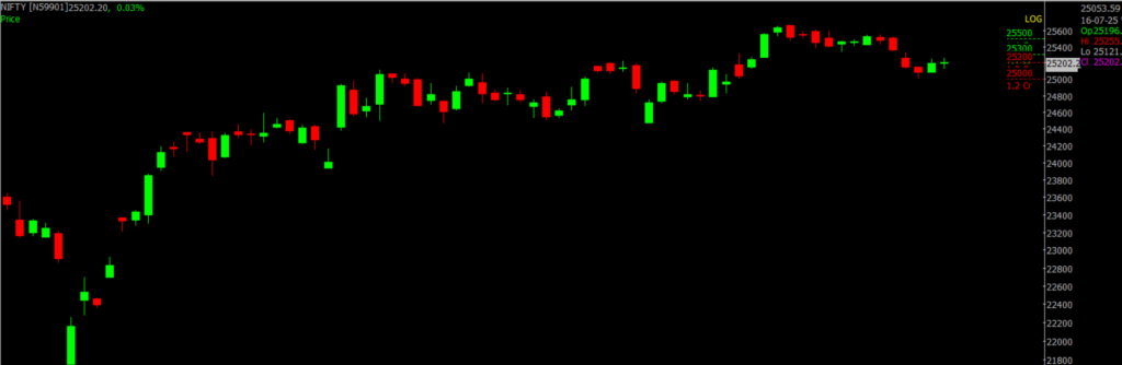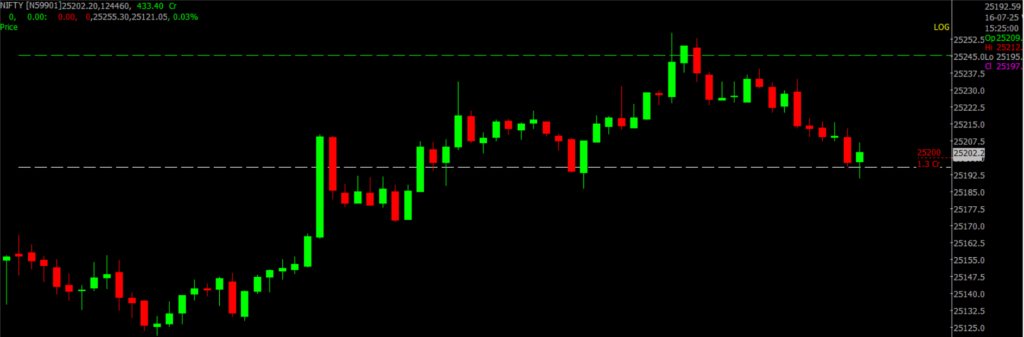 Today, the benchmark indices traded in a narrow range, with the Nifty closing 16 points higher and the Sensex up 64 points. The PSU Bank sector performed well, rising over 1.7%, while some profit-taking was seen in Metal and Defense stocks. The small daily candle and sideways movement suggest that neither buyers nor sellers are fully in control. The market is likely to find strong support around 25,100 for the Nifty and 82,300 for the Sensex. As long as it stays above these levels, the positive sentiment should continue. Resistance is expected between 25,200 and 25,600, while support is seen between 25,000 and 24,600. The market may also bounce back towards the 20-day moving average if the momentum improves.