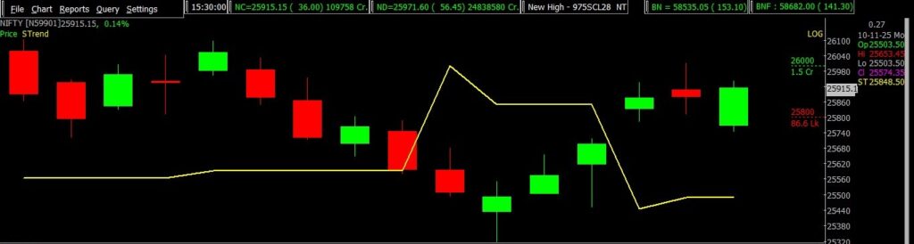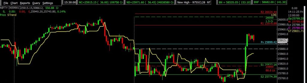 NIFTY, currently at 25,910, continues to trade in a positive trend. Long positions can be held with a daily closing stop-loss at 25,699, while fresh short positions should be considered only if NIFTY closes below this level. On the upside, immediate resistance is placed between 25,900 and 26,400, whereas key support zones lie in the 25,700–25,400 range.