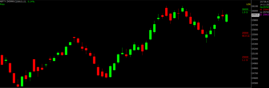 On Nov 14, Sensex was down 361.12 points at 84,117.55, while the broader Nifty was down 107.85 points at 25,771.30. About 1,674 shares advanced, 2,031 shares declined, and 135 shares remained unchanged.