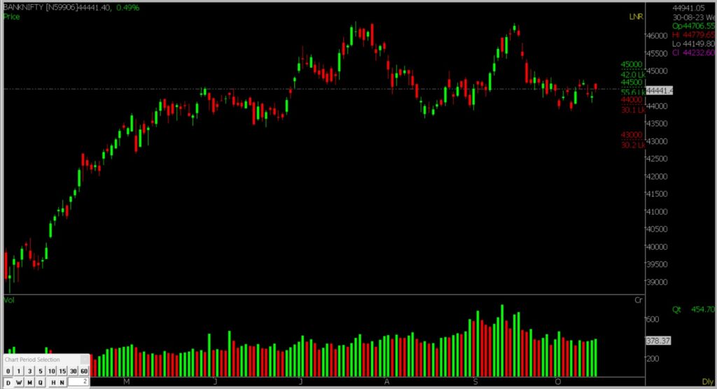 The market has been characterized by a consistent tug-of-war between bullish and bearish forces, leading to the index’s closing near the 44500 resistance level. This reflects the prevailing uncertainty and hesitation among market players. Presently, the index appears trapped within a wide-ranging pattern, with support at approximately 44000 and resistance at 45000. This pattern underscores the absence of a distinct, long-lasting trend in either direction.