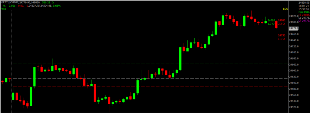 The Nifty started the day with a gap down but gained momentum throughout the session, ending at a new all-time high with an increase of 188 points. After two days of consolidation, a sharp upward movement was observed. The resistance level is between 24,800 and 25,000, while the support level is between 24,600 and 24,400.
