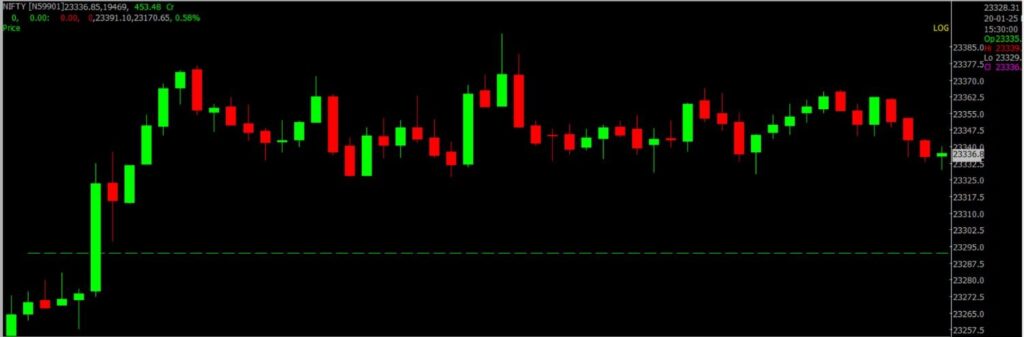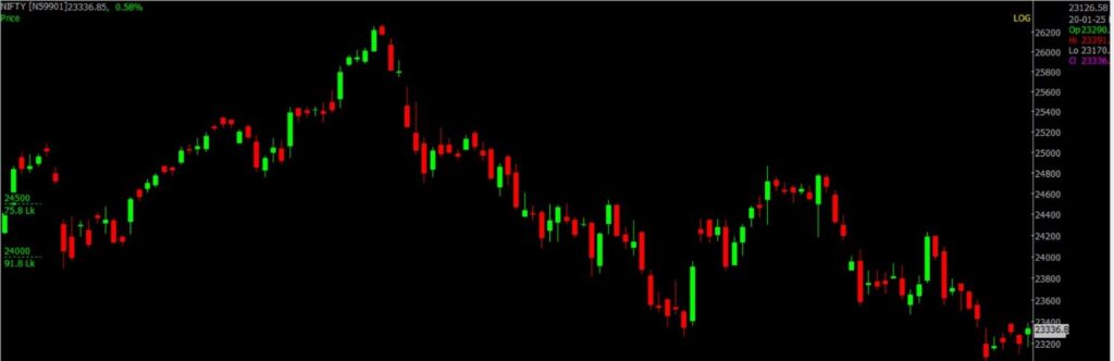 After a volatile start, the market made a strong upward move, closing with a gain of 141.55 points at 23,344.75. The index formed a bullish candle and ended the session near the top of its consolidation range. The key resistance lies between 23,300 and 23,500, while support is expected between 23,100 and 22,800.