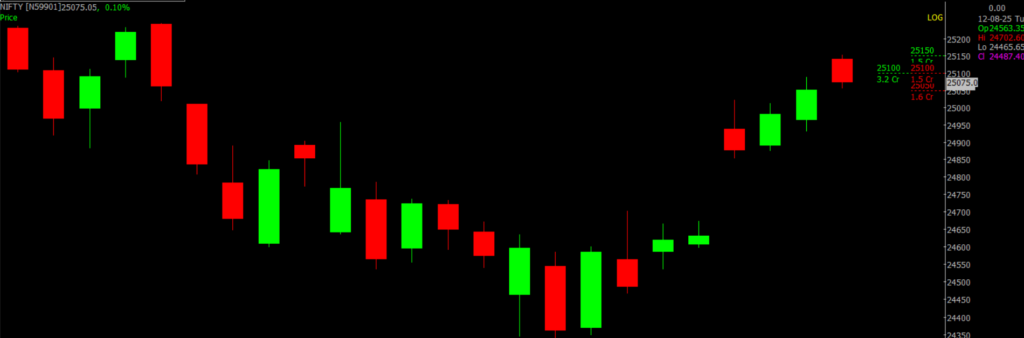 Overall, the broader market trend remains positive. However, for day traders, a strategy of buying on intraday dips and selling during rallies could be effective. Key resistance is seen between 25,100 and 25,400, with support likely in the 25,000–24,600 zone.