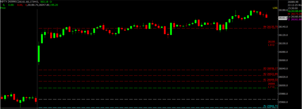 The Nifty opened with a strong gap-up and saw steady buying throughout the session, closing firmly higher at 26,172. On the daily timeframe, the index printed a large bullish candle and moved clearly above the short-term hurdle near 26,050. The follow-through buying after the early rise reflects strength in the ongoing recovery, indicating accumulation rather than profit booking. On the upside, resistance is placed in the 26,200–26,400 zone, while key support lies between 26,100 and 25,800.