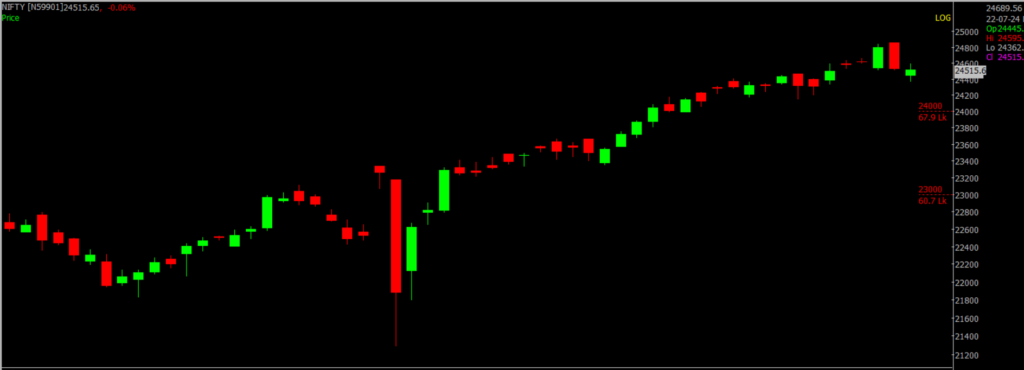 NIFTY formed a doji-like pattern after rebounding from early morning weakness but still closed slightly negative. The Union Budget presentation on July 23 is expected to cause significant intraday volatility. Resistance is projected at 25,000-25,500, while support is estimated at 24,300-24,000.