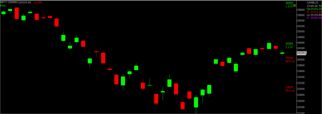 On April 23, Sensex was down 852.49 points at 77,664, and the Nifty 50 was down 205.05 points at 24,173.05. About 1688 shares advanced, 2409 shares declined, and 155 shares remained unchanged.