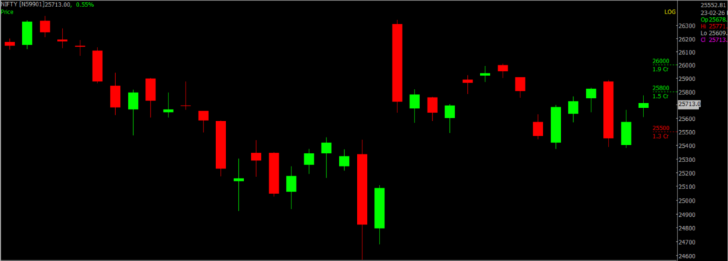 Nifty is showing signs of short-term recovery but continues to face selling pressure near higher levels, indicating a cautious undertone. On the downside, 25,500 remains the immediate support; holding above this level can help the index maintain stability and attempt another upward move. However, a decisive break below 25,500 may trigger fresh weakness and drag the index towards the next key support at 25,000. On the upside, the 25,800–26,000 zone acts as a strong resistance band, where profit booking is likely to emerge. A sustained move above 26,000 is required to strengthen bullish momentum and signal a potential continuation of the uptrend. Until then, the index may trade in a range with a cautious bias.