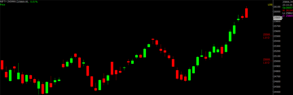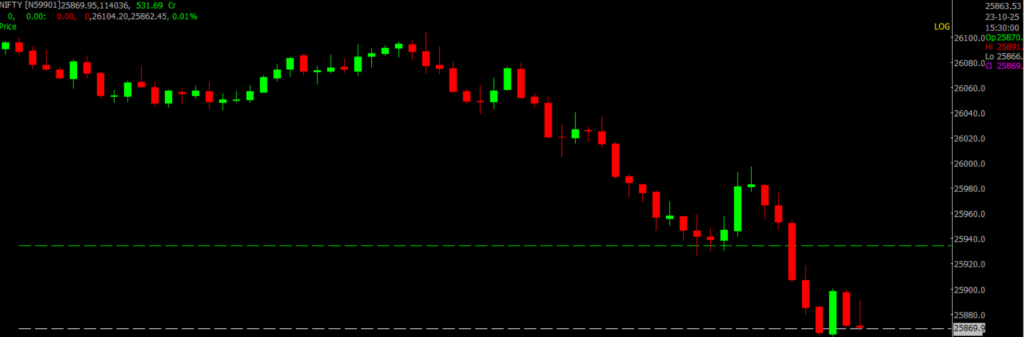 The Nifty wiped out its morning gains during the day, though the short-term trend remains positive. A large red candle on the daily chart suggests a possible pullback toward 25,700 in the coming days. However, the short-term uptrend stays intact, with chances of retesting higher levels near 26,200 in the next 10–15 days. Resistance is seen around 25,800–26,500, while support is placed between 25,700 and 25,000.