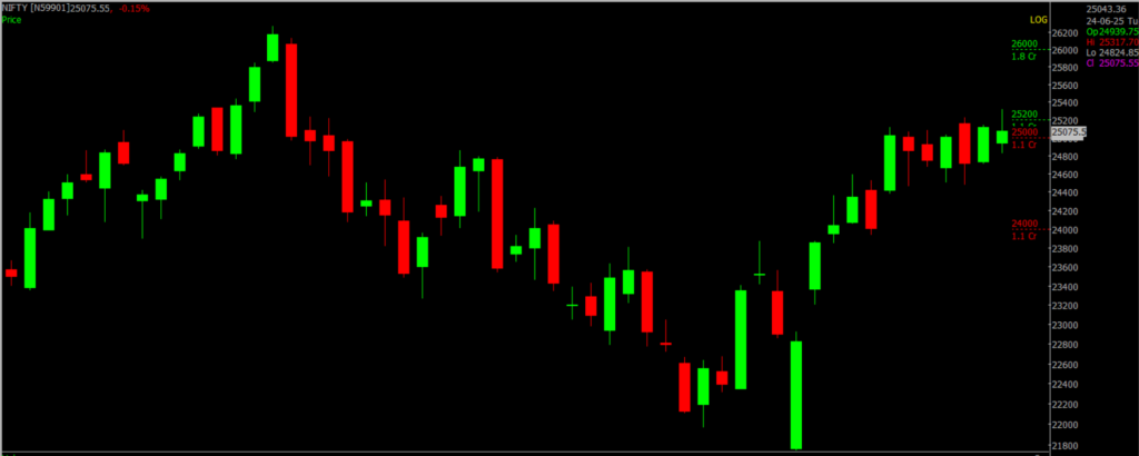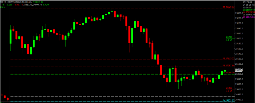 Nifty began the session with a strong gap-up of over 200 points, reaching an intraday peak of 25,318 — its highest level this year. However, profit booking in the latter half led to a sharp pullback of more than 300 points from the day’s high. The index eventually settled at 25,044, registering a gain of 72 points. Key resistance is seen in the 25,200 – 26,000 range, while support lies between 25,000 and 24,500.
