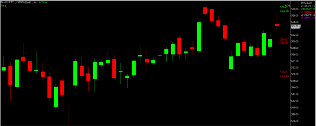 Bank Nifty opened on a strong note and surged towards the 56,900 mark during intraday trade but later pared nearly half of its gains to end the session at 56,462, up by 403 points. On the daily chart, the index formed a small bearish candlestick with extended wicks on both ends—resembling a high wave or Doji-like pattern indicating market indecision. Resistance is placed between 57,000 and 58,000, while support is seen in the 56,000 to 55,000 zone.