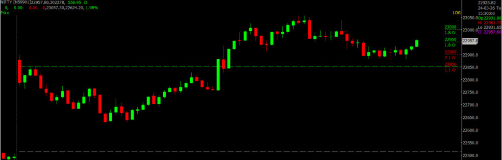 The Nifty opened on a strong note following early comments hinting at a possible de-escalation of the Middle East conflict. The index saw a sharp rally but faced resistance near the 23,000 mark, where call writers held significant positions.