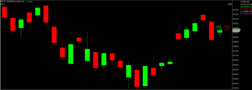 On the daily chart, a small positive candle with short upper and lower shadows (an inside-day type formation) was observed. This reflects a lack of follow-through selling pressure after Friday’s decline, which is a constructive signal for the market. Going ahead, resistance is expected around 25,000–25,500 levels, while immediate support lies in the 24,900–24,600 zone.