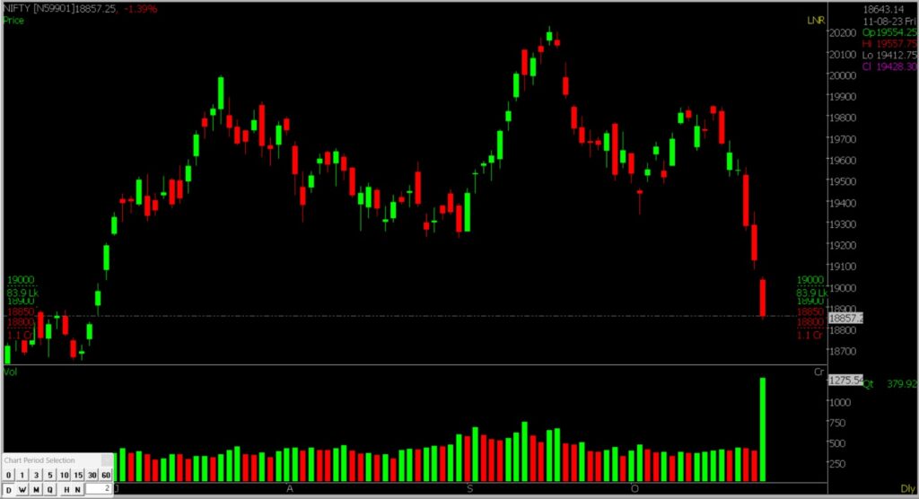 Amidst global uncertainty, investors turned away from local equities during the monthly F&O expiry, as the Nifty closed below 19,000 due to a sell-off in key sectors like banking, automobiles, and IT, driven by concerns regarding the ongoing West Asia conflict, economic instability, and worries about impending rate hikes, keeping a bearish outlook for the sixth consecutive session. Technically, the daily charts show a bearish candle and weak intraday patterns, indicating potential further declines below 19,000, with levels of 18,800-18,725 anticipated. However, a relief rally could be on the horizon if the 19,000 level is surpassed, potentially pushing the index towards 19,100-19,150.