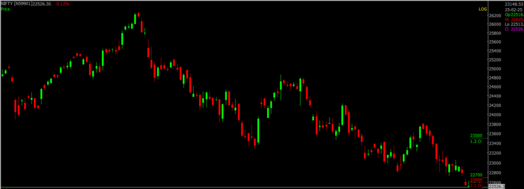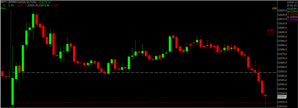 Nifty opened on a weak note, traded within a narrow range, and ended the session nearly flat at 22,548. On the daily chart, an inverted hammer candlestick pattern has formed. Resistance is seen in the 22,700-23,000 range, while support lies between 22,600 and 22,500.