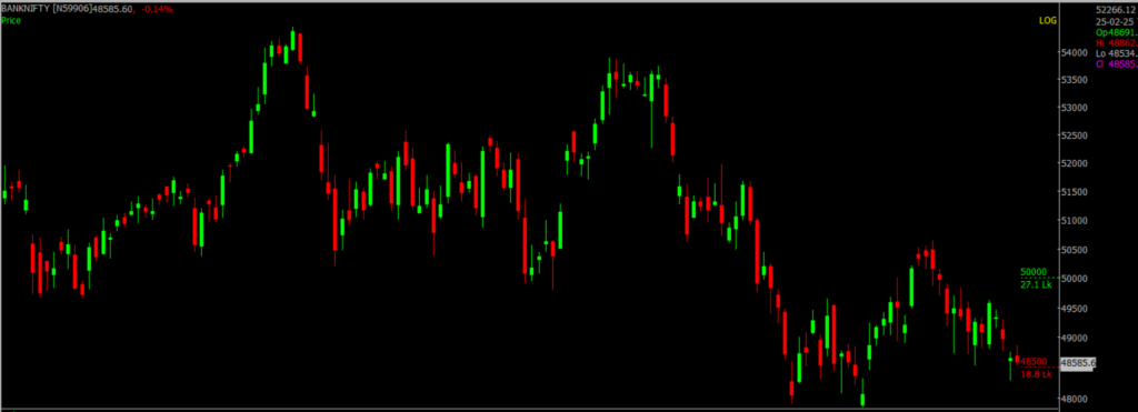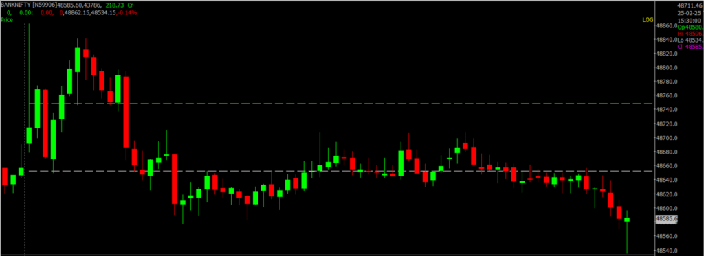 Bank Nifty started slightly positive but remained range-bound before closing lower at 48,608. The daily chart shows a red candle with a long upper shadow, indicating selling pressure at higher levels. Resistance is positioned between 48,800 and 49,500, while support is seen in the 48,500-47,500 zone.