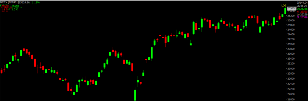 On June 26, Sensex gained 1,000.36 points, closing at 83,755.87, while the Nifty rose by 304.25 points to end at 25,549. Among the stocks, 1,983 advanced, 1,855 declined, and 151 remained unchanged.