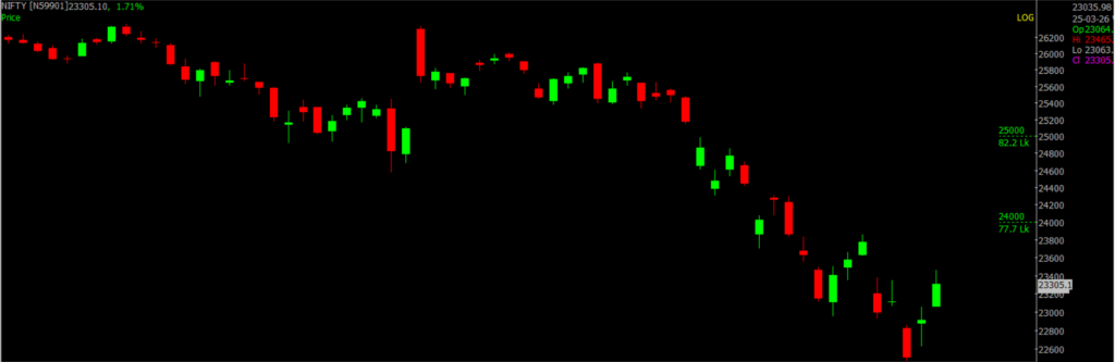 On March 25, Sensex was up 1,205 points at 75,273.45, and the Nifty was up 394.05 points at 23,306.45. About 2,841 shares advanced, 1,309 shares declined, and 134 shares remained unchanged.
