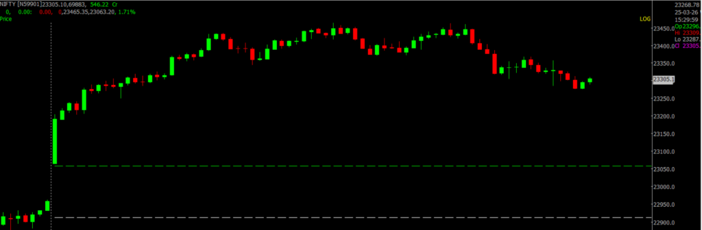 At present, Nifty is facing resistance near the previous gap zone from March 19, placed around 23,400–23,600 levels. The underlying trend remains positive, and a sustained move higher could take Nifty towards 23,850 in the near term, while any consolidation or dip may find support around 23,000. Key levels to watch remain resistance at 23,300–23,600 and support between 23,000–22,600.