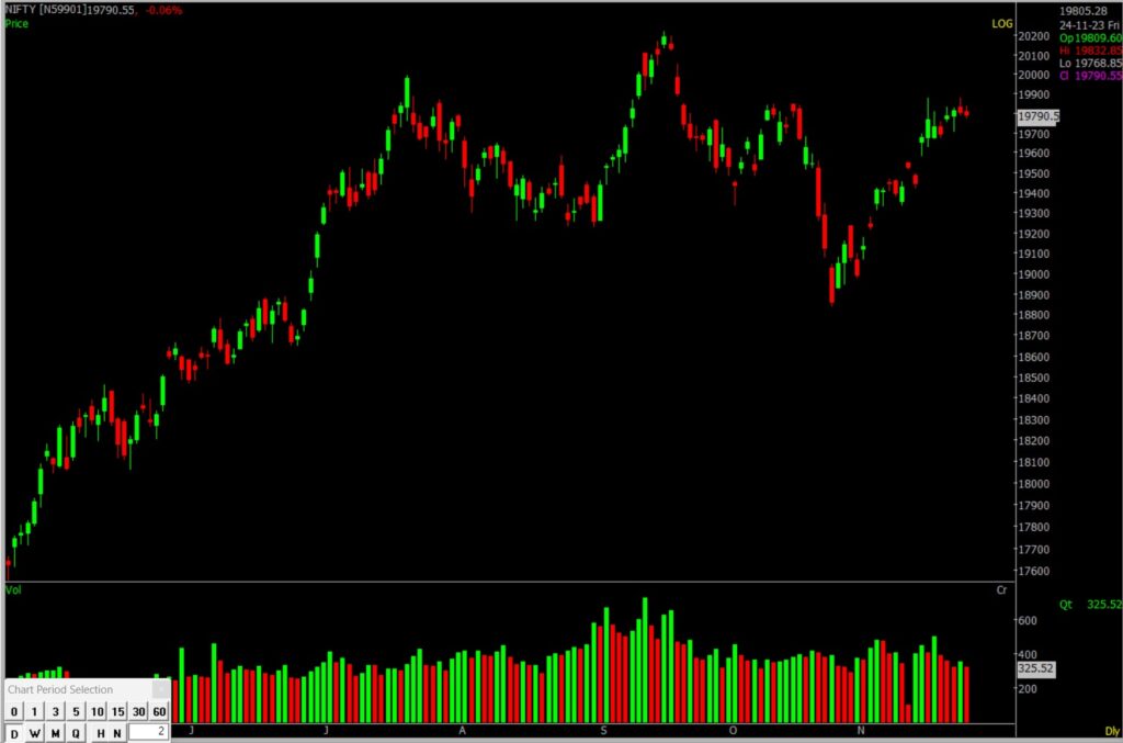 After a day marked by volatility, benchmark indices sustained losses on November 24, extending the downtrend into the second session, with IT stocks exerting significant downward pressure, while the pharmaceutical and metal sectors saw buying activity. The Sensex closed 47.77 points lower at 65,970.04, down 0.07 percent, and the Nifty slipped 7.30 points to 19,794.70, down 0.04 percent. Market breadth favored decliners, with small-cap stocks continuing their outperformance. Analysts suggest that a decisive gap-up move above 19,850 is crucial for a potential new high, emphasizing the importance of monitoring US markets and banking majors for cues while advocating a selective approach and caution against contrarian trades.