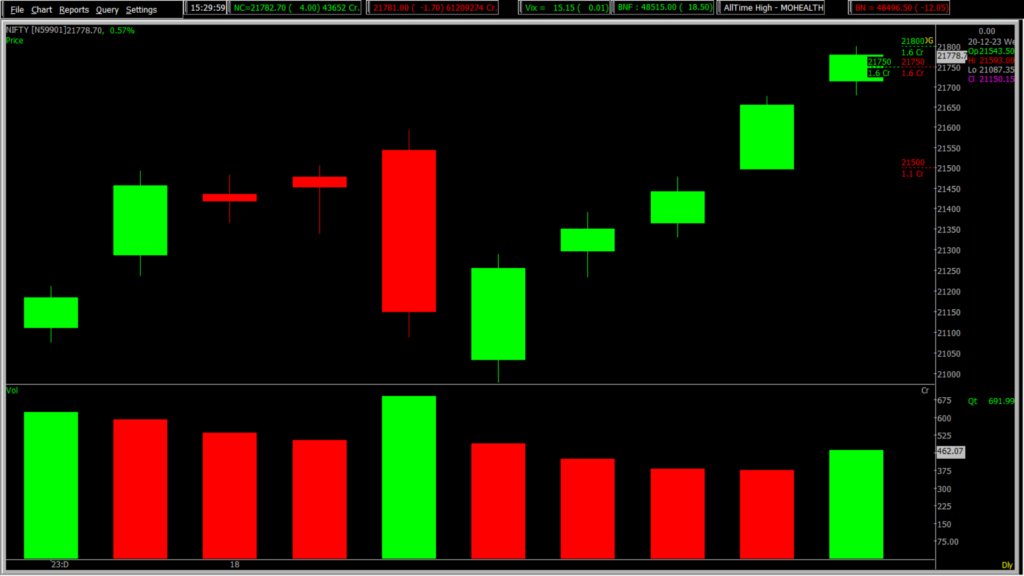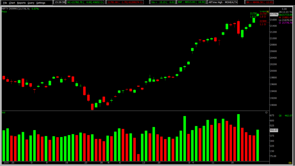 Nifty crosses 21,800 on final expiry of 2023; Sensex jumps 372 pts.