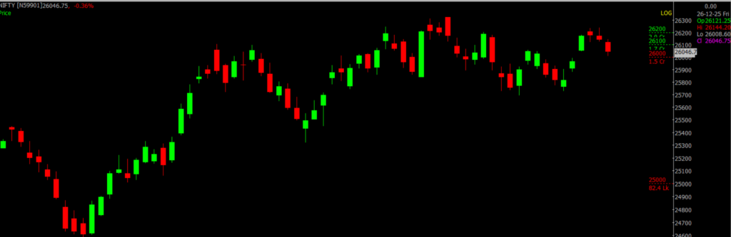 On Dec 26, Sensex was down 340.65 points at 85,068.05, and the Nifty was down 92.45 points at 26,049.65. About 1,708 shares advanced, 2,098 shares declined, and 128 shares were unchanged.