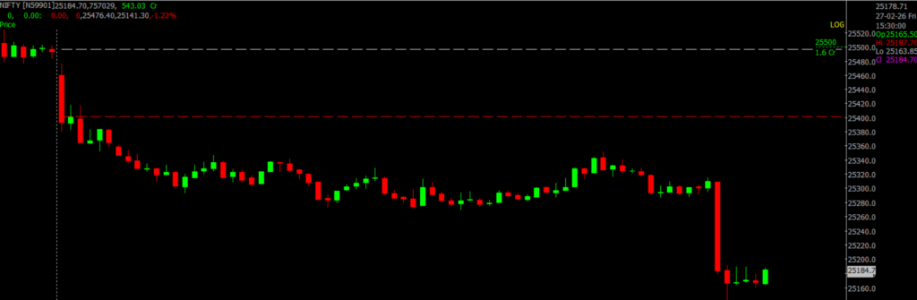 The 25,100 zone now turns critical. A sustained move below this level could accelerate downside momentum toward 24,800. Immediate resistance is placed in the 25,500–25,800 band, while near-term support is seen in the 25,000–24,500 range.