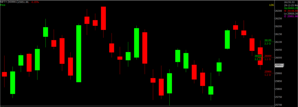 | Highest Put Writing at | 26,000 (1.1 Cr) |