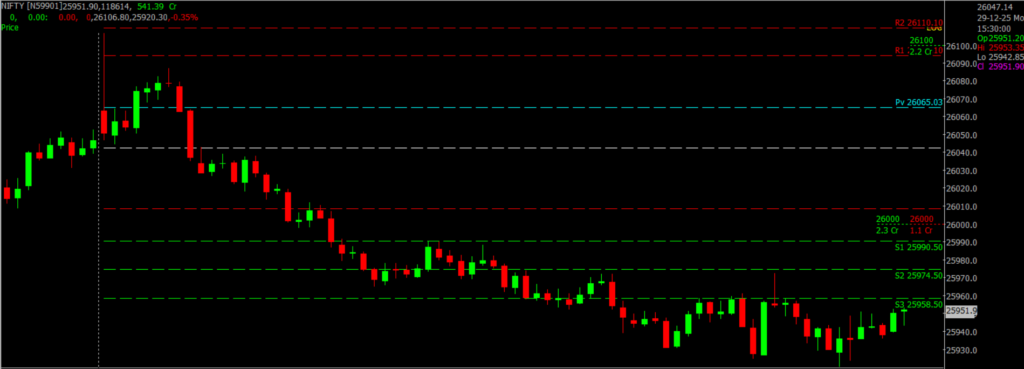 The market remained weak for the third straight session on Monday, with Nifty closing 100 points lower. After a positive opening, selling pressure dragged the index down through most of the session, ending near the day’s lows. A long bearish candle on the daily chart signals a short-term correction. Despite this weakness, the broader trend still shows higher highs and higher lows since mid-month, suggesting the possibility of a higher-bottom formation, though confirmation is pending. Resistance lies between 26,100–26,500, while support is seen in the 26,000–25,500 zone.
