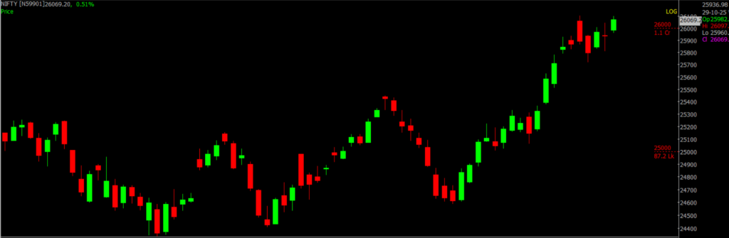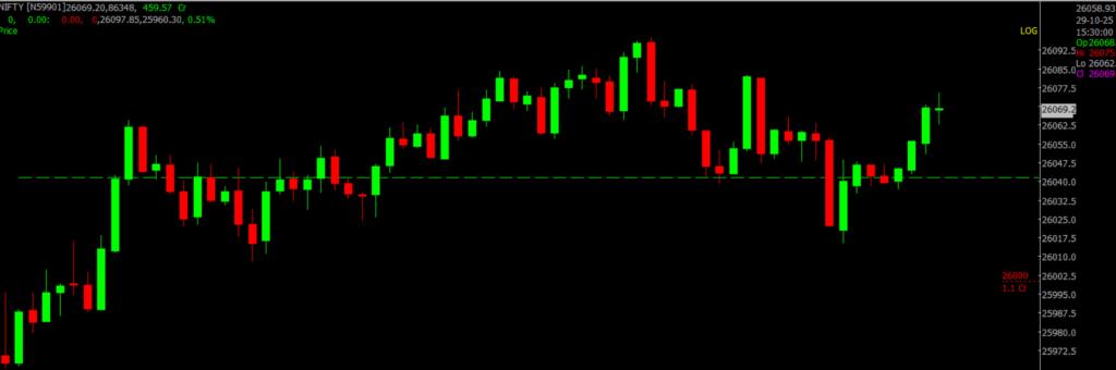 Nifty moved steadily higher through the session but couldn’t cross 26,100, making an intraday high of 26,098. This formed a small candle on the daily chart, showing mild selling near resistance.