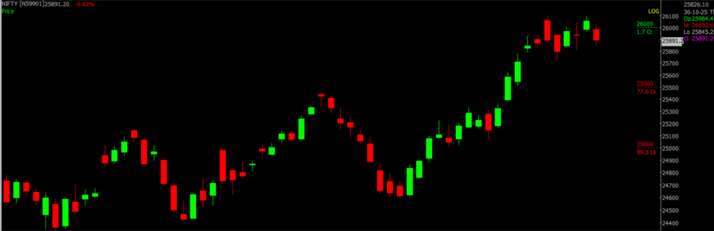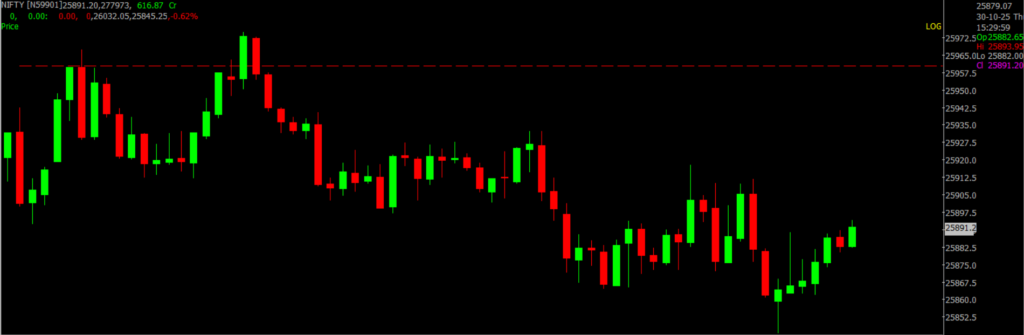 The Nifty fell 0.68% on Thursday to close below 25,900, as investor sentiment turned cautious after U.S. Fed Chair Jerome Powell’s hawkish comments raised fears of prolonged high interest rates. Global uncertainty also persisted ahead of the extended Trump–Xi meeting, which sparked hopes of progress on trade talks.