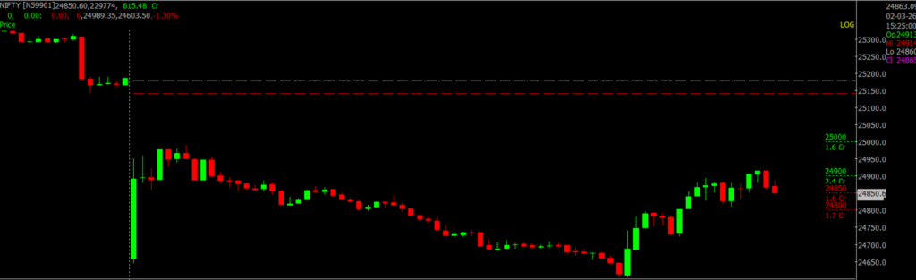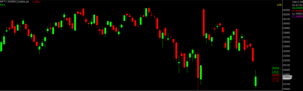 Amid escalating war-related developments, NIFTY 50 witnessed a highly volatile session today. The index opened with a sharp gap-down of nearly 400 points but quickly recovered close to 200 points, reflecting aggressive intraday dip buying. However, volatility persisted through the session with sharp swings on both sides, and Nifty eventually closed at 24,850, down about 330 points.