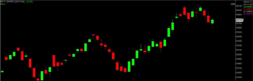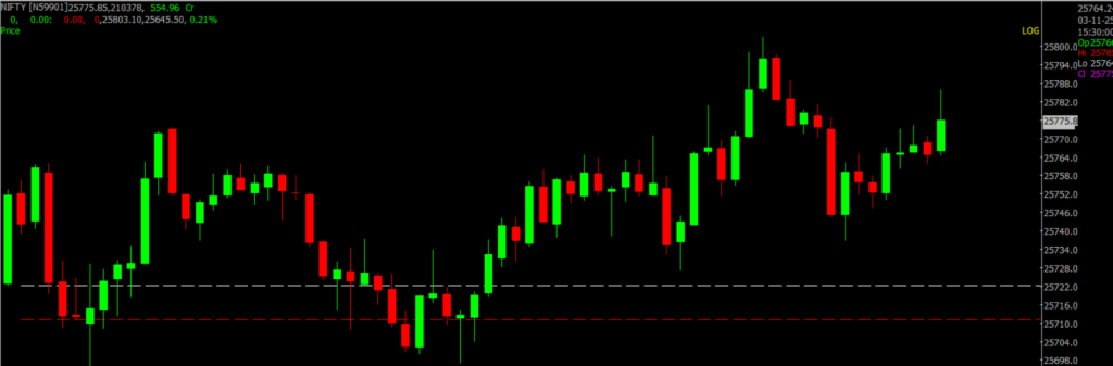 The Nifty opened flat, showed volatility on both sides, and ended the day almost unchanged at 25,763. On the daily chart, it found support near its previous breakout level and formed a green candle, indicating buying interest at lower levels. If the index holds above 25,645, a short-term recovery is likely; however, a fall below this level could extend weakness toward 25,450–25,400, where the next major support zone lies. On the higher side, 26,100 remains a strong resistance, and as long as Nifty stays below this level, any upside move can be used for profit booking. Overall, resistance is seen at 25,700–26,100 and support at 25,600–25,200.