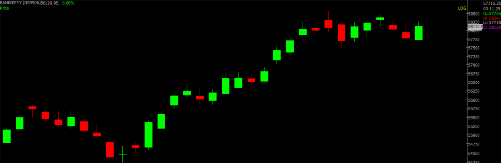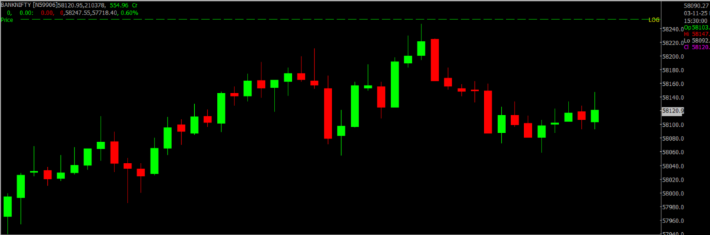 The Bank Nifty opened flat, saw buying interest throughout the session, and ended the day on a strong note at 58,101. On the daily chart, it formed a bullish engulfing pattern near its recent breakout point, indicating strength and positive momentum. Immediate support is placed around 57,630, and as long as the index holds above this level, it may attempt to retest the recent high of 58,580. Short-term traders can consider buying near 57,630 with profit booking around 58,580. Overall, key resistance levels are at 58,100–58,500, while support is seen at 57,700–57,000.
