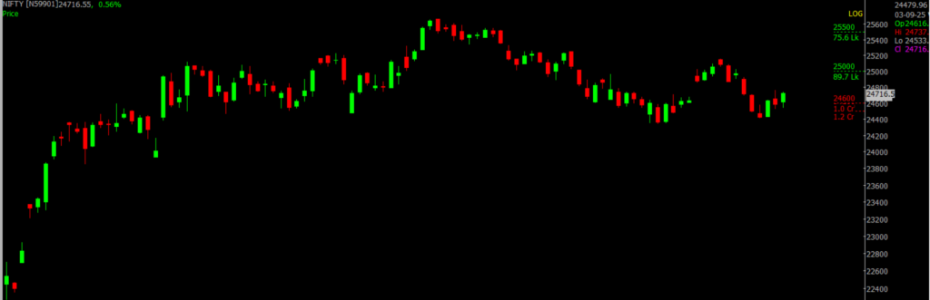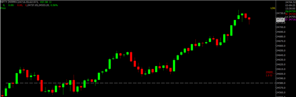 Indian markets ended higher after a mixed start, supported by hopes of a consumption-driven boost from potential GST slab changes. Consumer-focused sectors like discretionary, durables, and staples outperformed. Globally, gold hit new highs as investors stayed cautious amid ongoing US tariff concerns and geopolitical risks. Nifty faces resistance at 24,600–24,900 and has support at 24,000–24,500.