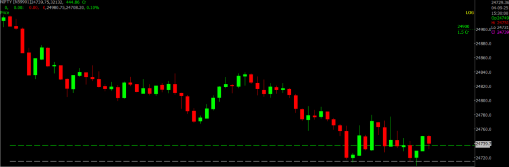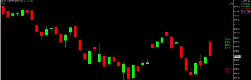 Markets witnessed a volatile session and ended marginally higher, supported by sweeping GST reforms that signaled a structural tax overhaul. The Nifty opened on a strong note, driven by sharp gains in auto and consumer staples, but profit-taking and weakness in select heavyweights dragged the index lower as the day progressed. It eventually closed with modest gains at 24,734.30. However, the broader indices underperformed after the recent rally, with both the midcap and smallcap segments losing over half a percent each. Going forward, the Nifty faces resistance at 24,900–25,300 and finds support at 24,700–24,400.