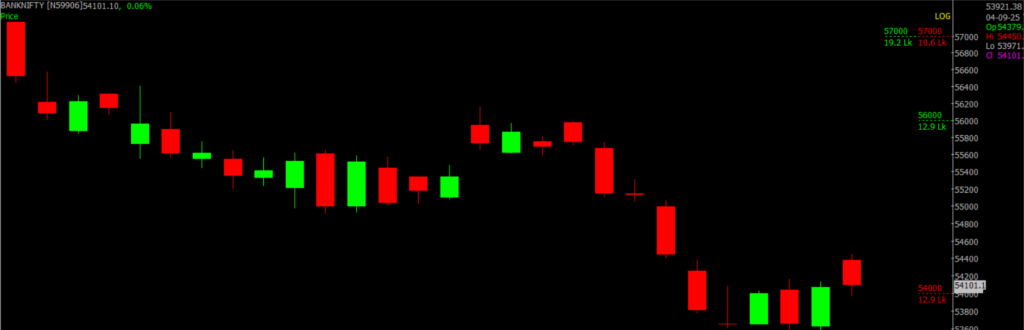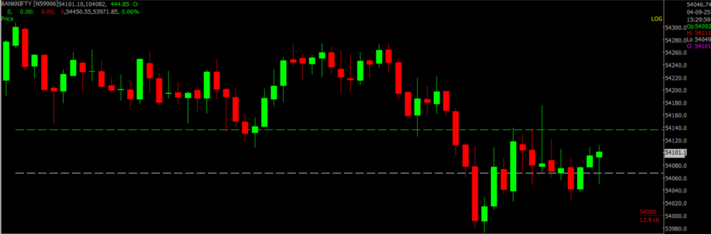 Banknifty, currently at 54,075, remains in a negative trend. Traders holding short positions are advised to continue with a daily closing stop loss at 54,346. A fresh long position can be considered only if Banknifty closes above the 54,346 level. Resistance is expected between 54,300 and 54,800, while support is seen in the range of 54,000 to 53,500.