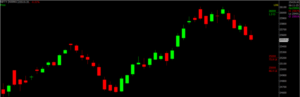 Markets remain range-bound due to high valuations and global uncertainty. Focus now shifts to foreign inflows and Q2 FY26 earnings, including LIC’s results. The rupee stays stable around 88.6, with resistance at 25,500–25,900 and support at 25,400–25,100.