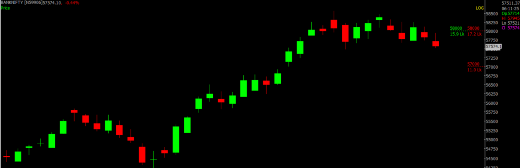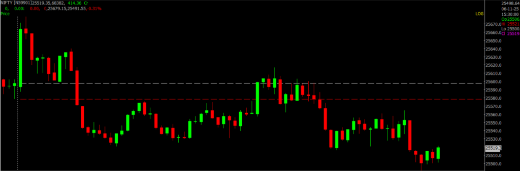The Bank Nifty extended its decline for the second straight session and is now consolidating near its previous swing support zone. On the daily chart, it formed a bearish candle with a long upper shadow, signaling that buyers struggled to sustain higher levels as selling pressure persisted through the day.