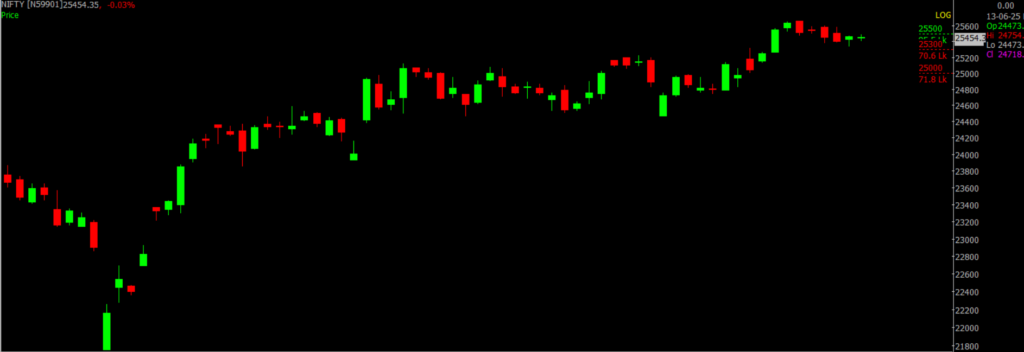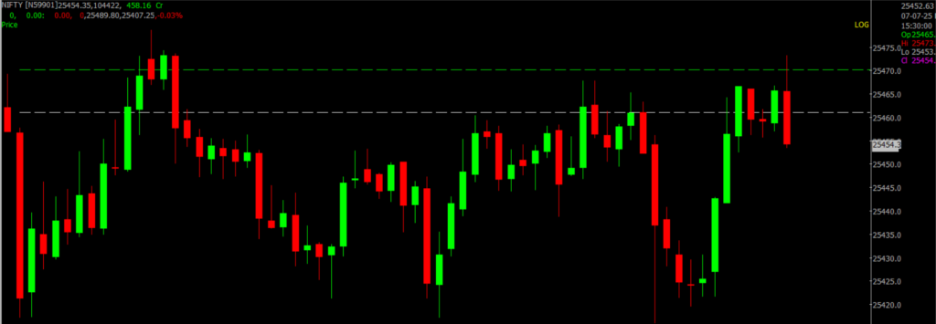 Today, the market moved in a narrow range. A small candle on the charts suggests no clear trend. The Indian Rupee dropped about 0.25% due to a stronger US Dollar and higher oil prices. Global trade worries and risk aversion also weighed on sentiment. US President Donald Trump warned of a 10% tariff on nations with anti-US policies, including BRICS. Nifty faces resistance at 25,450 and 26,000, with support at 25,300 and 24,900.