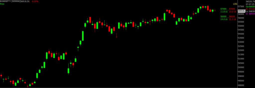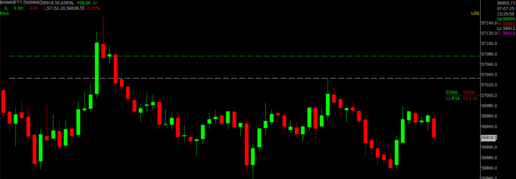 Banknifty is in a negative trend. If you’re holding short positions, continue to hold with a daily closing stoploss at 57,388. New long positions can be considered only if Banknifty closes above 57,388. Resistance is in the 57,100–57,600 range, while support is between 57,000 and 56,300.
